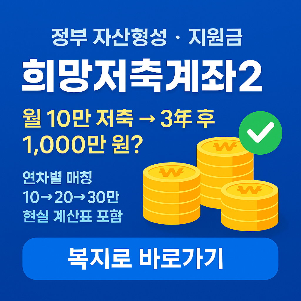 희망저축계좌2는 일하는 주거·교육급여 수급가구 및 차상위를 대상으로, 내가 매달 일정 금액을 저축하면 정부가 연차에 따라 매칭 적립금을 더해주는 3년 만기 자산형성 제도예요. 2025년 이후 신규 가입자는 1년차 10만 원 → 2년차 20만 원 → 3년차 30만 원으로 정부 적립금이 늘어나는 구조가 적용됩니다.
